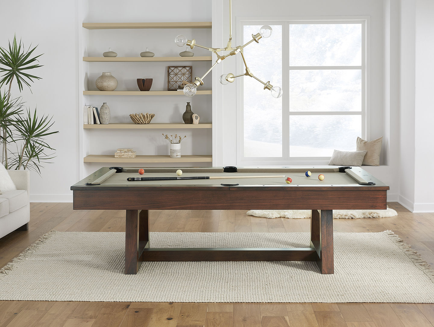 The Aiden Pool Table is an 8-foot pool table providing simplistic elegance and outstanding game performance that exceeds performance specifications. Designed with the warmth of walnut and blended with engineered wood and acacia for stability, features include custom leather drop pockets, stain-resistant cloth, and rail sights that are decorative and functional. The Supreme Accessory kit includes all the tools needed to inspire exceptional play.