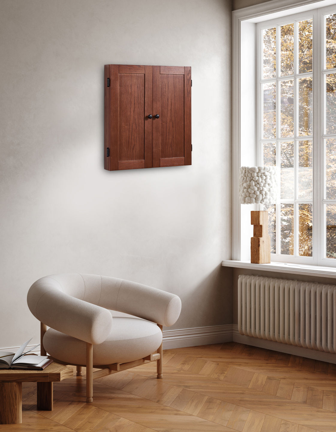 - The dart board cabinet is completely built and the dart board itself is hung inside of the cabinet. The consumer must simply attach it to their wall using the supplied brackets