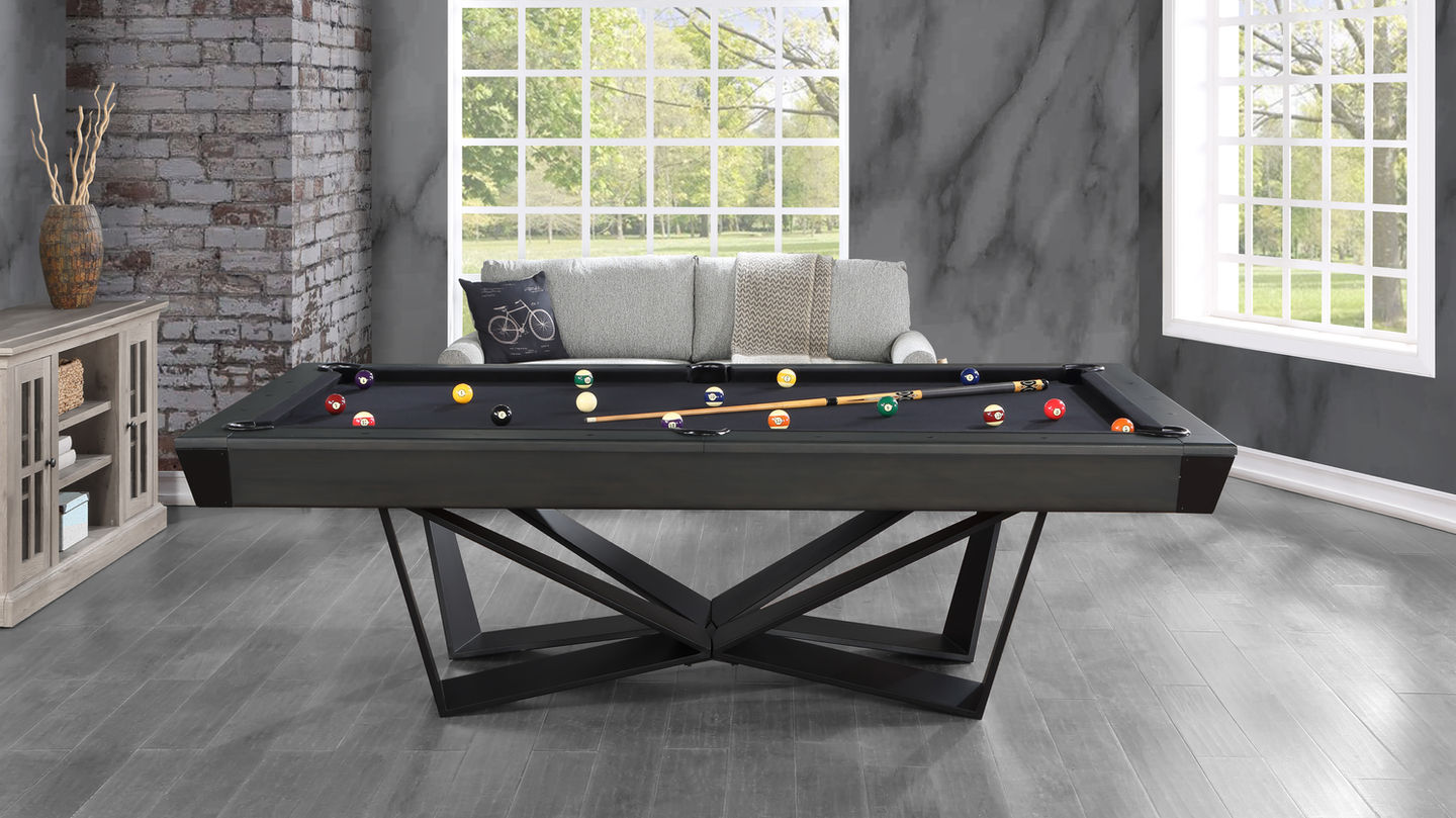 The Alton Pool Table brings an enhanced gaming experience right at home. Showing off a sleek, modern profile and open geometric legs, this contemporary pool table is a true centerpiece finished by hand using a multi-step process in a beautiful smoke finish. This clean-lined, classy table is masterfully crafted of kiln-dried solid Maple, Birch veneers, Acacia, and other hardwoods. The table is designed for professional game play with 1", three-piece certified slate for the highest quality experience possible, complemented by K66 natural cushion rubber on each rail that lends a consistent, authentic, and even rebound. The Teflon-coated, spill-resistant cloth is met with custom drop pockets made of leather for consistent, quiet play as well as a great look and feel. Commanding attention in any setting, the coordinating, decorative sights of this pool table combines functionality for game play and beauty that matches the design itself.
