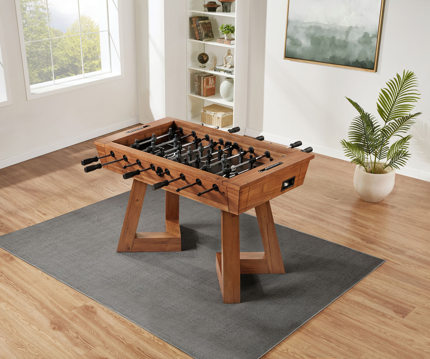 Bring energy and elegance to your game space with the Aris Foosball Table — a thoughtfully designed piece that blends timeless fun with modern craftsmanship. Its bold, angular legs not only provide a stable foundation for intense matches but also serve as a distinctive design feature. Constructed from sturdy engineered wood and finished in a warm, natural tone, the Aris makes a stylish statement in any room.