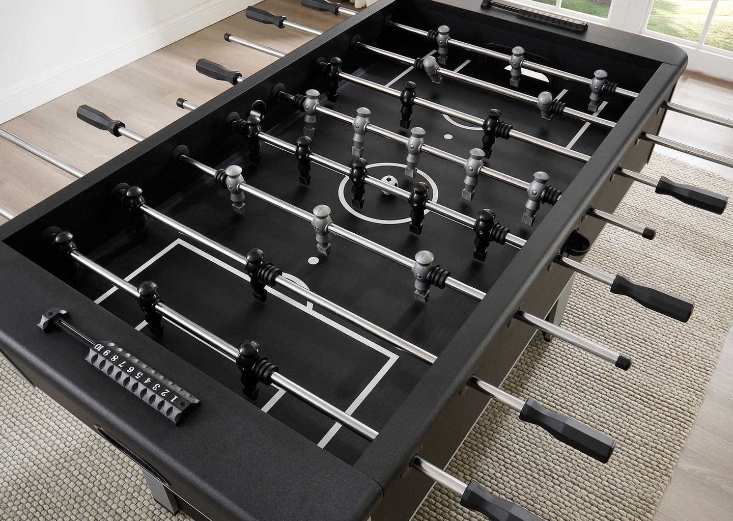 69029761-750c-e8f1-64b1-8166d1c07f1b|26-1264|Astro Foosball Table|undefined|/product-page/astro-foosball-table|<p>The Astro Foosball Table combines sleek contemporary styling with smooth, competitive gameplay. Finished in matte black with crisp silver accents, it features precision steel rods, balanced players, and integrated scoring for fast-paced matches - bringing modern design and classic foosball action together in one striking table.</p><p> </p><p><strong>The Astro Foosball Table Features and Benefits:</strong></p><ul><li>Includes 2 Manual, Inset Scoring Systems</li><li>Includes Adjustable Leg Levelers for uneven play surfaces</li><li>Includes 2 Ball Returns</li><li>Includes 2 Balls made of ABS</li><li>Includes Counter-Balanced Rugby Players made of ABS</li><li>Includes Seamless Steel Rods</li></ul><p> </p><p><strong>This Product is Made Of:</strong></p><ul><li>MDF, PVC Laminate</li></ul><p> </p><ul></ul><p><strong>Approximate Product Dimensions: </strong></p><ul><li>55.25"W x 29.50"D x 34"H x 170lbs.</li></ul><p> </p><p> </p>|c0d238_c81b0fd335d4404eb3e3bd2faf52528d~mv2.jpg|4443e642-1be4-7d07-ba9c-a65042832459,038e18cc-fa36-aa0d-6012-59c9f0931b91,63e6821d-9e77-5239-43f2-2b3f10fe1686,ba5e39bd-46b9-eb52-726e-9fa447dc7eff,1f4e2066-b27d-4ba9-cb87-ea6d4e46f2de,57f964de-e06b-d459-e76a-1ecae34bcb9b,00000000-000000-000000-000000000001