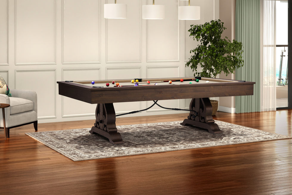 Bring timeless elegance and exceptional craftsmanship to your game room with the 8' Charthouse Pool Table. Featuring a refined trestle-style base with intricate carved detailing, this table combines classic design with sturdy construction for a truly impressive centerpiece. Built with solid pine rails and steel leg runners, it offers both beauty and durability. Whether you’re hosting friends or enjoying a casual game night, the Charthouse delivers professional-quality play in a design that complements any space.