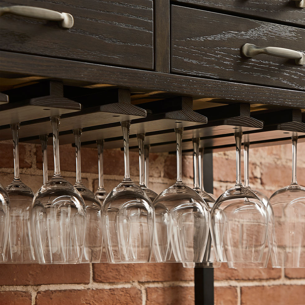 The Lowell Wine & Bar Cabinet is designed for elevated entertaining with a distinctly industrial edge. Finished in matte black with brushed steel accents, it pairs rich brown drawers and shelving with thoughtful storage, including stemware holders, a gridded wine rack, and a mirrored interior with integrated touch-control lighting. Two pull-out Formica workstations and smooth-glide drawers add unexpected functionality to the sleek silhouette. Equal parts statement and workspace, Lowell brings modern utility to the home bar.