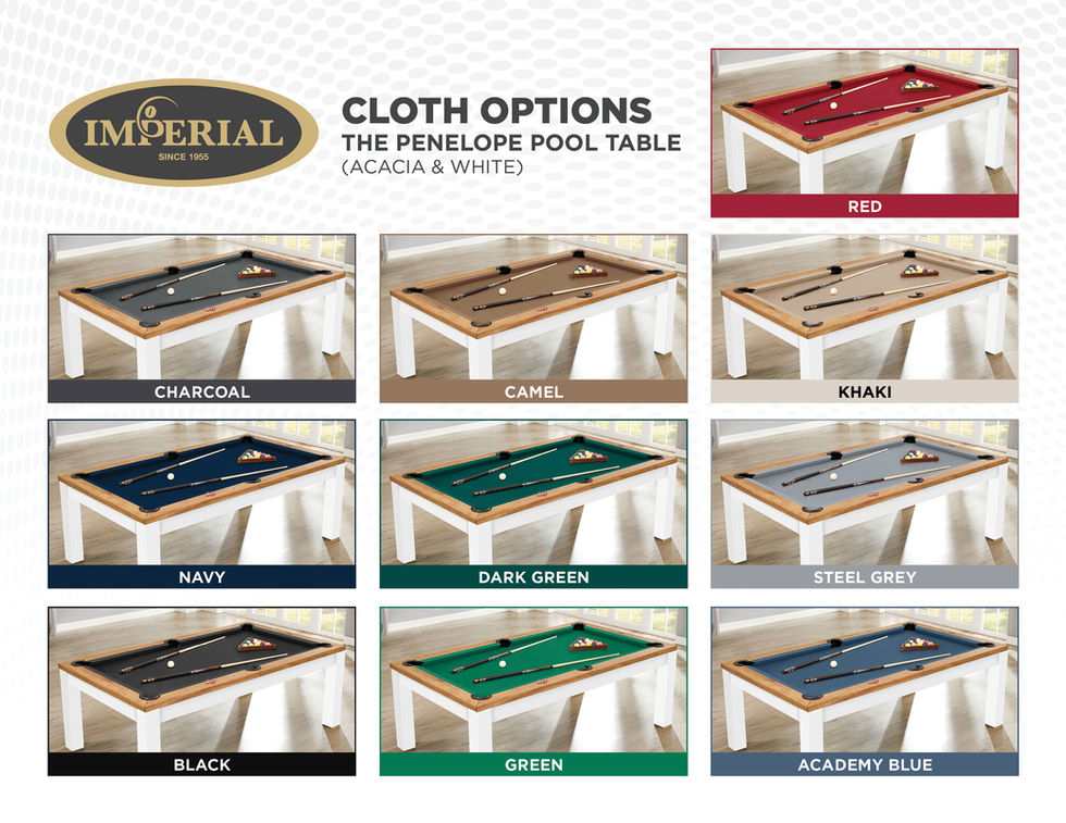 The Penelope II has the same sleek, clean frame of the first-generation table but with a thinner overall body. This table's post legs, wood frame, and steel support beams provide maximum stability. It also has a slate-leveling system to ensure a consistent playfield. This table also comes with a dining top that can convert the table from a place to play to a place to dine. All Imperial pool tables are skillfully crafted and designed by billiard experts and enthusiasts.