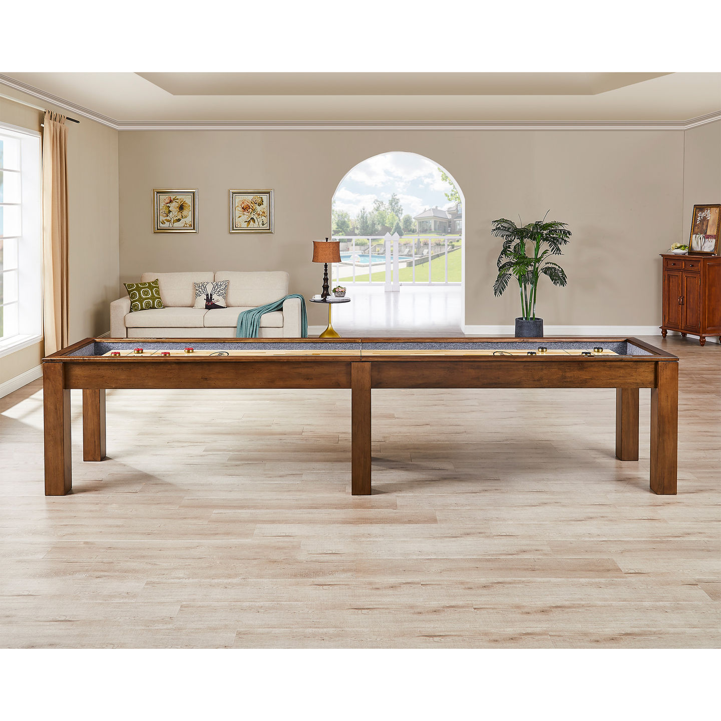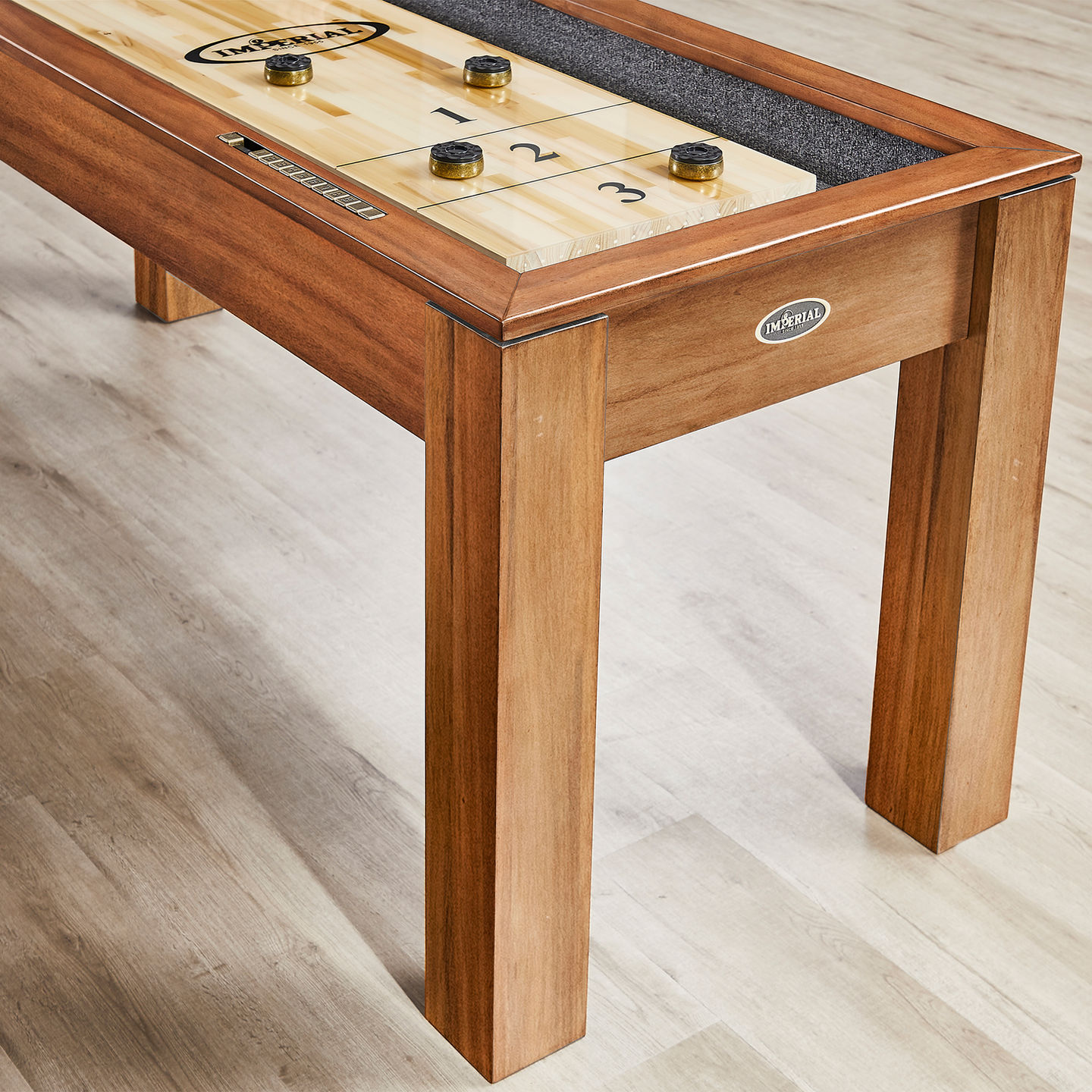 The Imperial Penelope 12ft Shuffleboard Table is an authentic pub-style table made of solid wood with an Acacia finish. The table has a 1.7" (44mm) solid wood playing surface to provide a great puck slide. Solid wood post legs provide clean lines and a modern look and add stability. Includes 4 red and 4 blue shuffle pucks, inlaid scoring markers, a can of speed 5 powder, and a playfield brush. Great fun for the entire family!