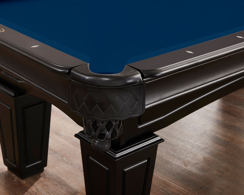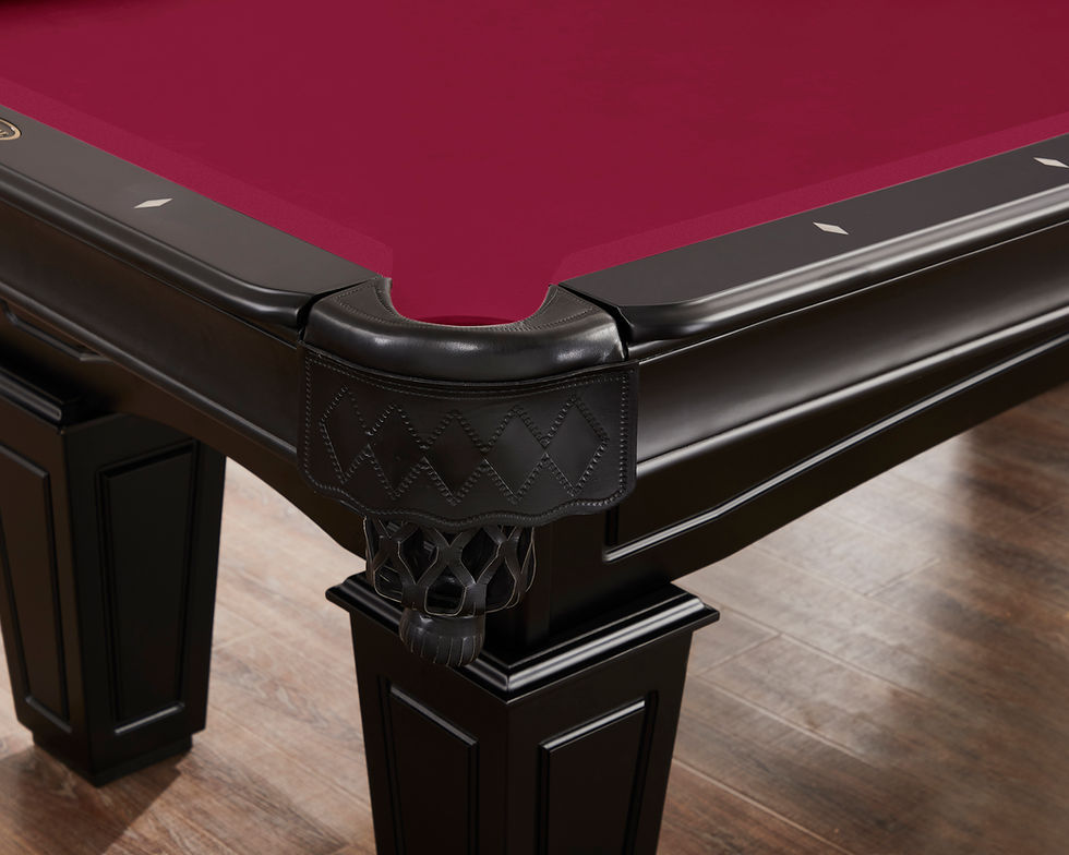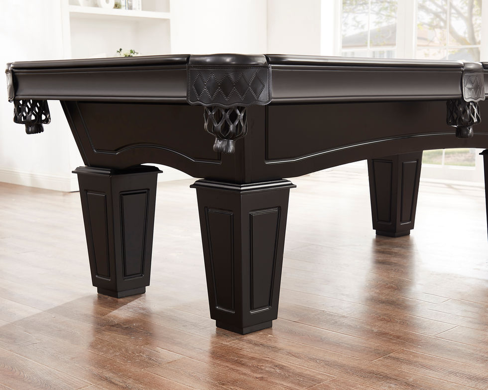 A great table at an affordable price! The slightly arched body is a detailed wood veneer mounted to engineered wood to prevent warping while the legs are solid wood to provide stability. The Matte Black finish and the bonded leather shield pockets add a sleek elegance that will work in any decor. All Imperial pool tables are skillfully crafted and designed by billiard experts and enthusiasts.